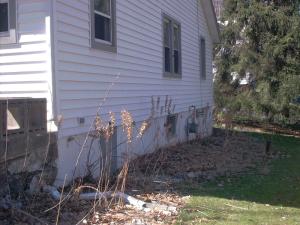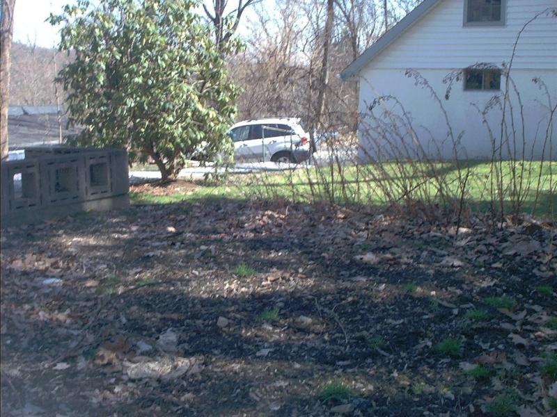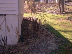 The side of the house where all sorts of dead plants are still sticking out of the ground, including the evil thorny rose vine things.