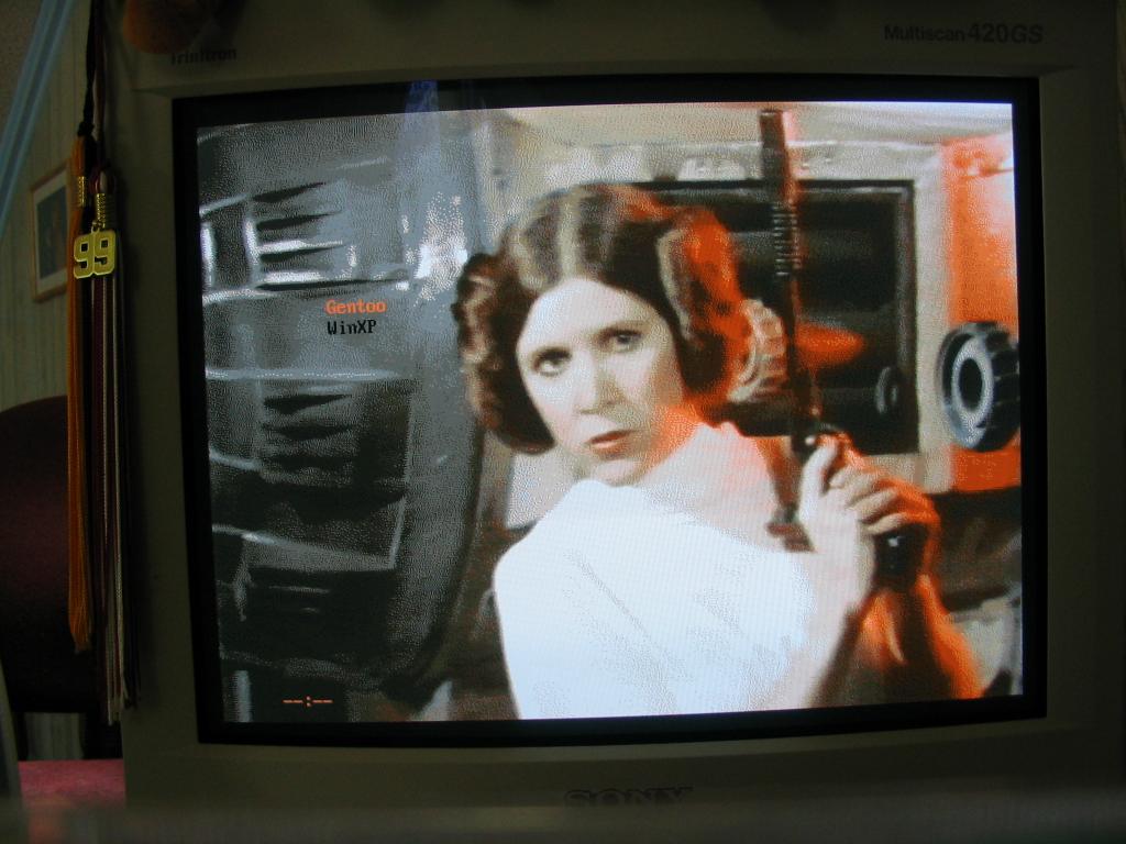 The bitmap image that I use is here: leiaLilo3.bmpThe following is a photo I took of my monitor while booting up: